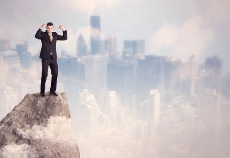 A successful good looking businessman standing on top of a high cliff above the city scape with clouds concept