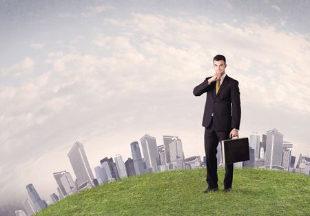 A successful male good looking business man standing in small green grass in front of city landscape with skyscrapers concept.