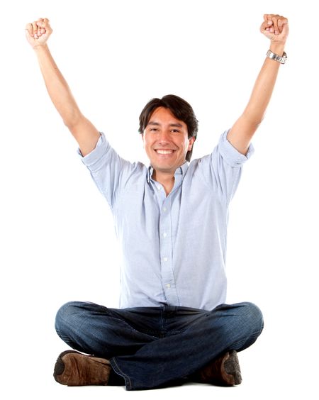 Successful man with arms up and smiling isolated over a white background
