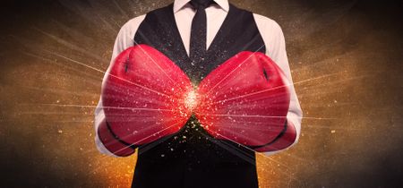 A successful powerful business person in red boxing gloves concept with illustrated power lines and pieces falling apart in front of explosion.
