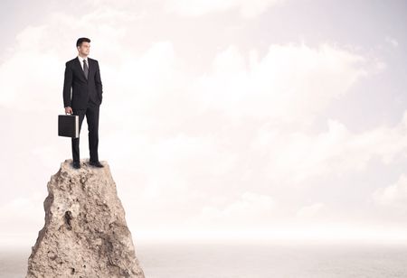 Successful sales person with brief case standing on top of a mountain cliff edge looking above the landscape between the clouds