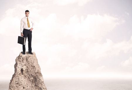 Successful sales person with brief case standing on top of a mountain cliff edge looking above the landscape between the clouds