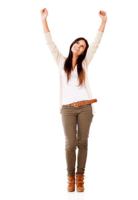Successful woman celebrating with arms up - isolated over white