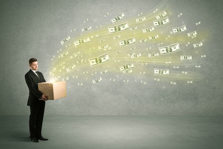 Successful young sales person making a lot of money concept illustrated with euro dollar bills flying out of a box held in his hand.
