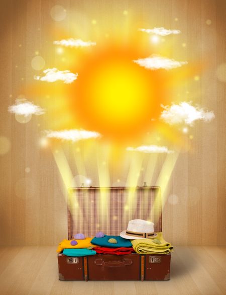 Summer bright sun with clouds and tourist bag and grungy background