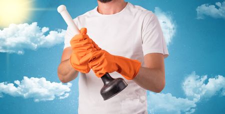 Sunny and cloudy concept with male housekeeper and orange gloves on his hand