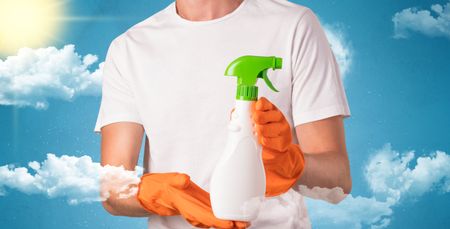 Sunny and cloudy concept with male housekeeper and orange gloves on his hand