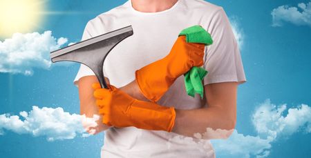 Sunny and cloudy concept with male housekeeper and orange gloves on his hand