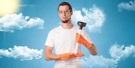 Sunny and cloudy concept with male housekeeper and orange gloves on his hand