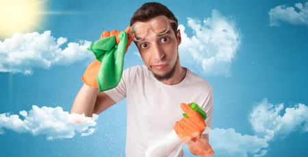 Sunny and cloudy concept with male housekeeper and orange gloves on his hand