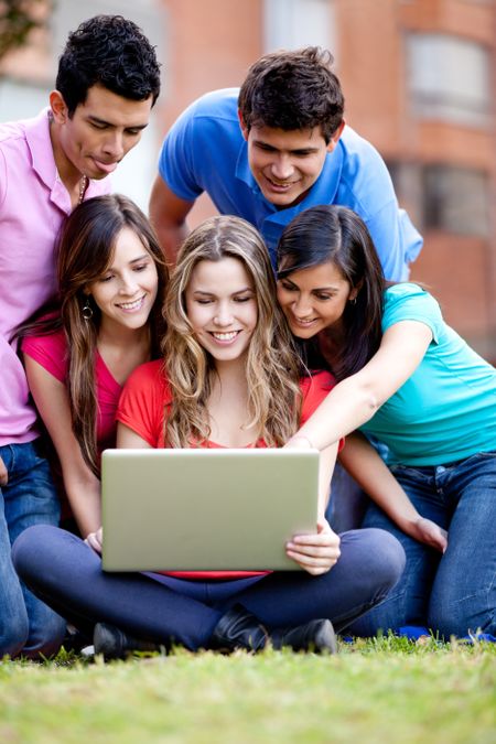Surprised group of friends looking at a laptop outdoors