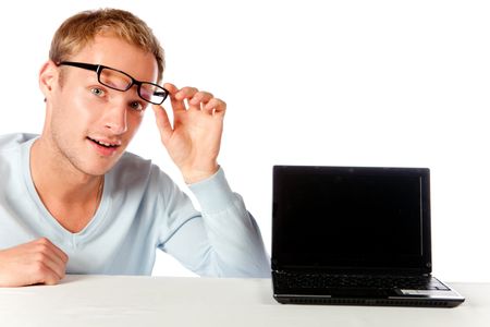 Surprised man with a laptop and glasses ? isolated over white