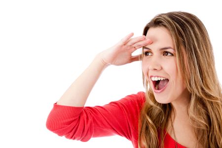 Surprised woman looking away - isolated over white