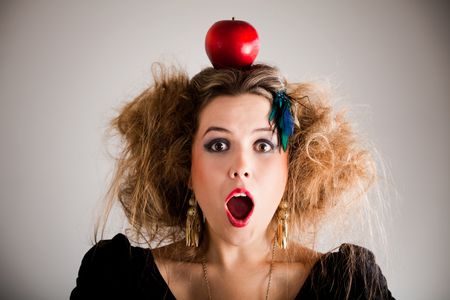 Surprised woman with a messy hairdo and an apple on top