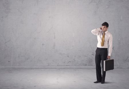 A surprised young sales person in elegant suit standing in empty urban environment with grey concrete wall background concept