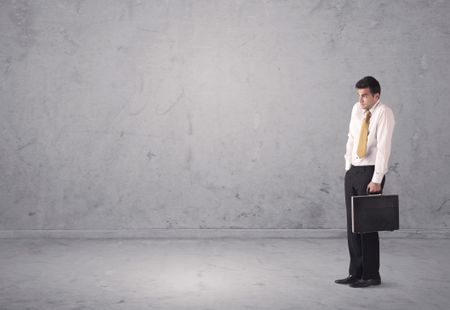 A surprised young sales person in elegant suit standing in empty urban environment with grey concrete wall background concept