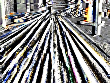 Surreal industrial abstract: Embossed illustration of steel bars and other equipment for assembly of scaffolding on a construction site