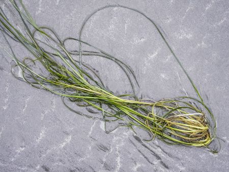 Symbol of ecology: Seagrass (binomial name: Zostera marina; also known as seawrack and common eelgrass), green and wet, from Pacific Ocean, on sandy beach in state of Washington