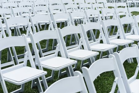 Symmetry of love: Rows of white folding chairs on lawn before a wedding ceremony in summer
