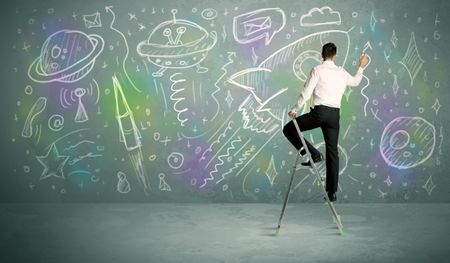 A talented student drawing rockets, planets on extraterrestrial life from a small ladder