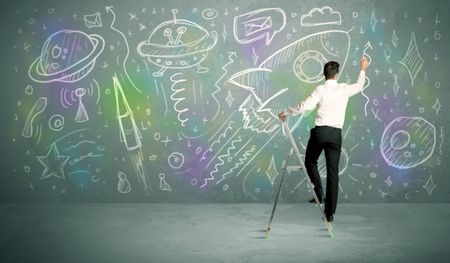 A talented student drawing rockets, planets on extraterrestrial life from a small ladder
