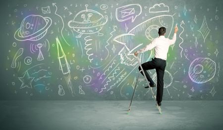 A talented student drawing rockets, planets on extraterrestrial life from a small ladder