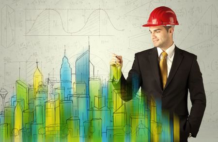 A talented young architect drawing a plan of a future city with blue, green, yellow buildings, churches, including lines and measurements.