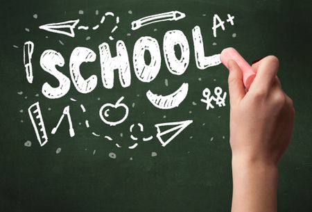 A teacher writing school, drawing children things on clean green chalkboard by hand
