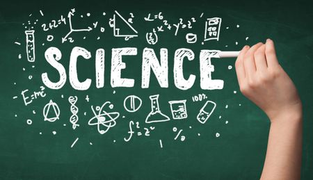 A teacher writing science, drawing chemistry elements on clean green chalkboard by hand