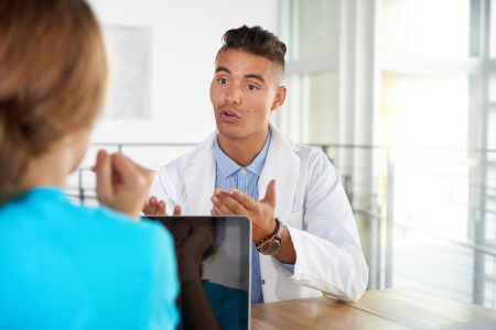 Team of doctor and nurse discussing a patient diagnosis sitting at the desk in bright modern office