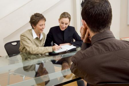 Team organizing time in planner with guy looking on.