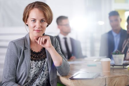team of successful business people having a meeting in executive sunlit office