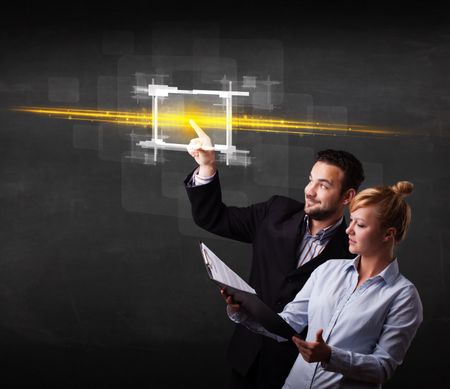 Tech couple touching button with orange light beams concept
