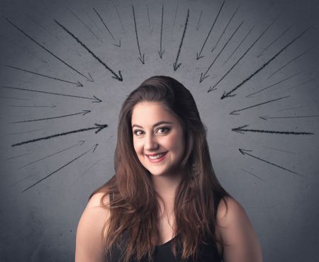 A teenage student girl under pressure while making happy face expressions illustrated with black arrows pointing at her head on the wall blackground concept.