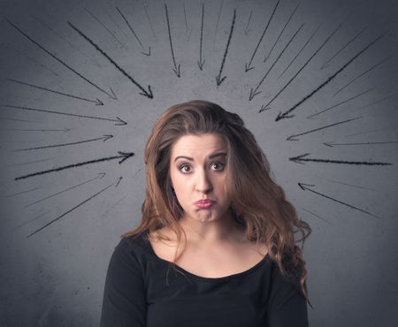 A teenage student girl under pressure while making happy face expressions illustrated with black arrows pointing at her head on the wall blackground concept.