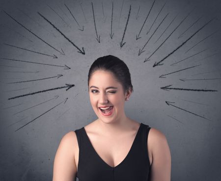 A teenage student girl under pressure while making happy face expressions illustrated with black arrows pointing at her head on the wall blackground concept.