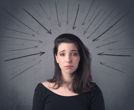 A teenage student girl under pressure while making happy face expressions illustrated with black arrows pointing at her head on the wall blackground concept.