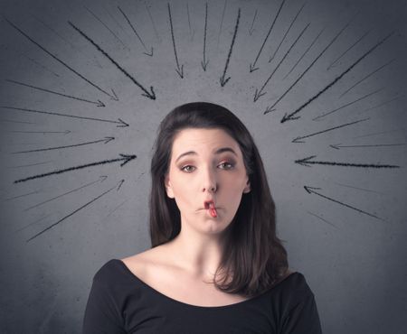 A teenage student girl under pressure while making happy face expressions illustrated with black arrows pointing at her head on the wall blackground concept.