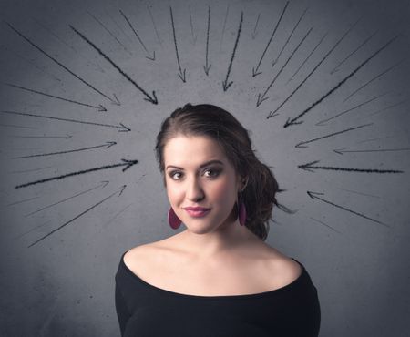 A teenage student girl under pressure while making happy face expressions illustrated with black arrows pointing at her head on the wall blackground concept.