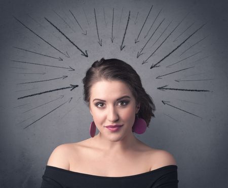 A teenage student girl under pressure while making happy face expressions illustrated with black arrows pointing at her head on the wall blackground concept.