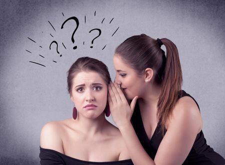 A teenager girl looking confused with drawn question marks above the head, while a girlfriend whispers something in her ear concept.