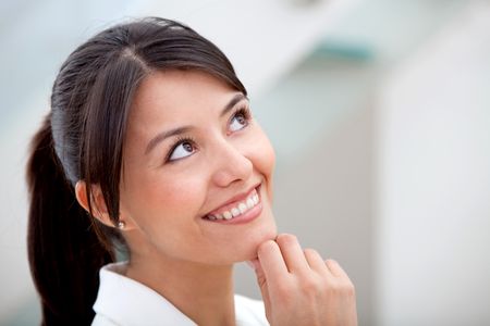 Thoughtful business woman at the office and smiling