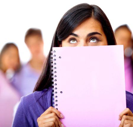 Thoughtful female student covering her face with a notebook - isolated over a white background