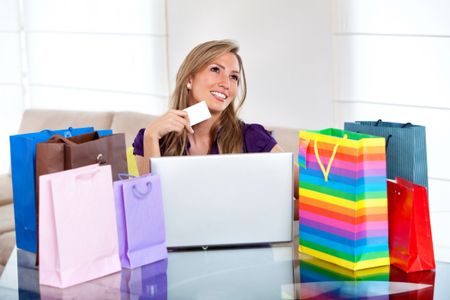 Thoughtful woman portrait shopping online with bags
