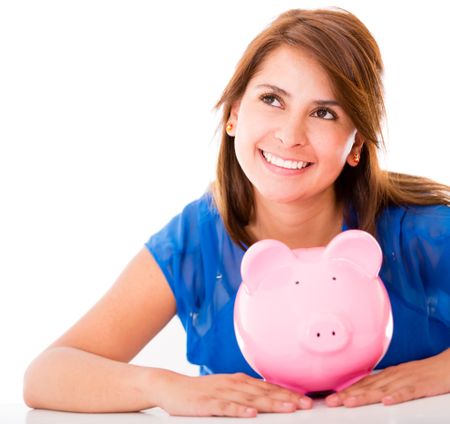 Thoughtful woman with her savings - isolated over a white background