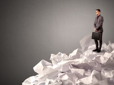 Thoughtful young businessman standing on a pile of crumpled paper with a deep grey background