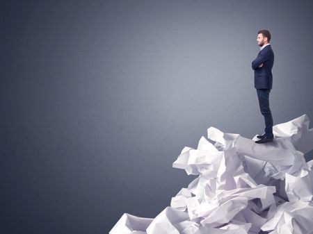 Thoughtful young businessman standing on a pile of crumpled paper with a dark grey background