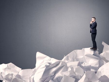Thoughtful young businessman standing on a pile of crumpled paper with a grey background