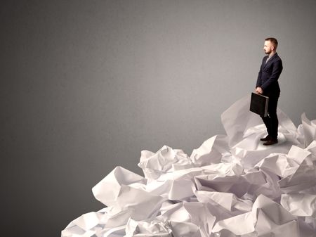 Thoughtful young businessman standing on a pile of crumpled paper with a deep grey background