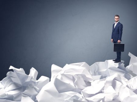 Thoughtful young businessman standing on a pile of crumpled paper with a blueish grey background